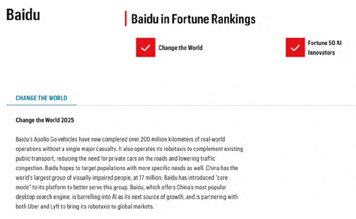 9月24日,百度入选《财富》2025年“改变世界”公司榜单!本次入选,得益于萝卜快跑在自动驾驶领域的影响力与安全性。
